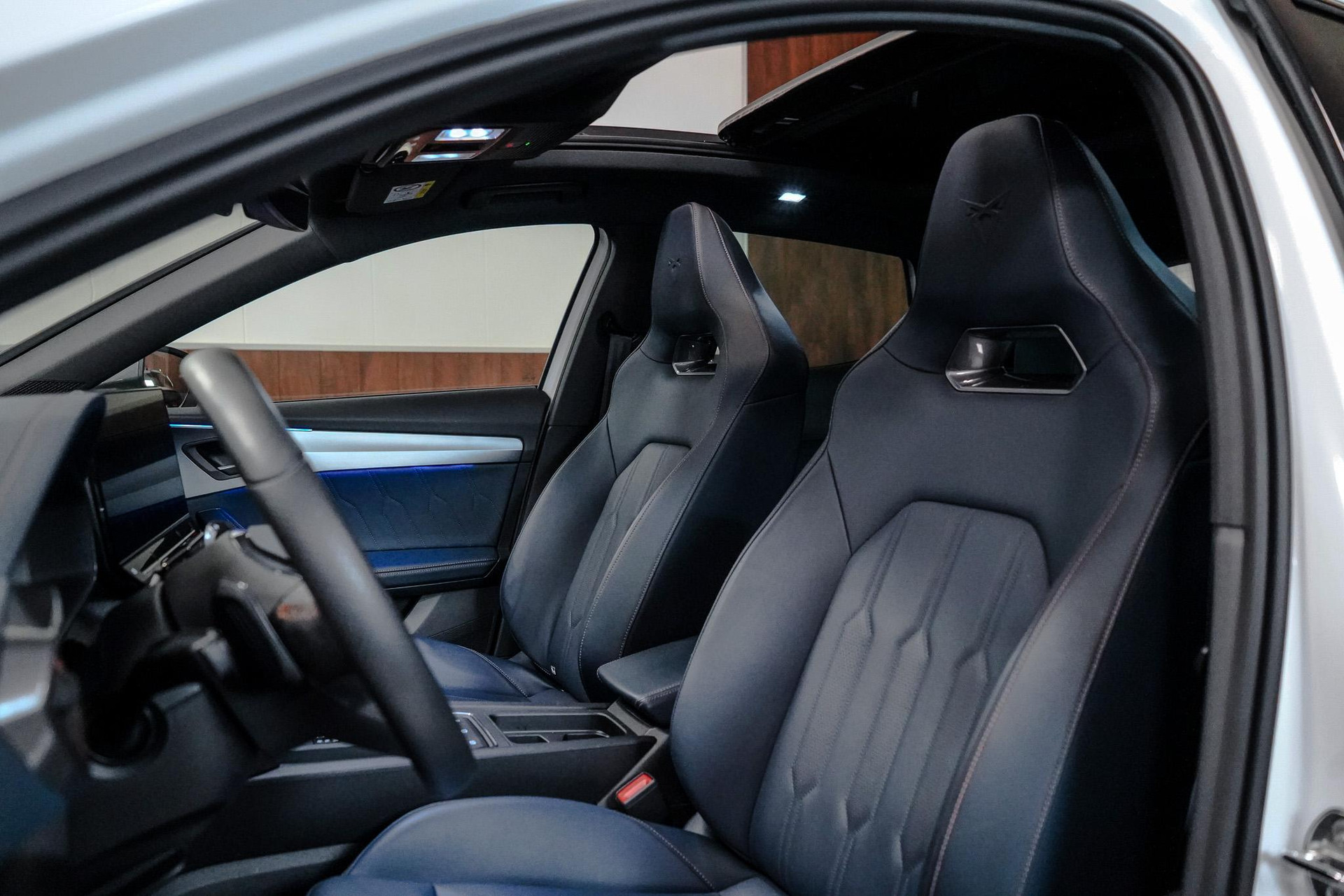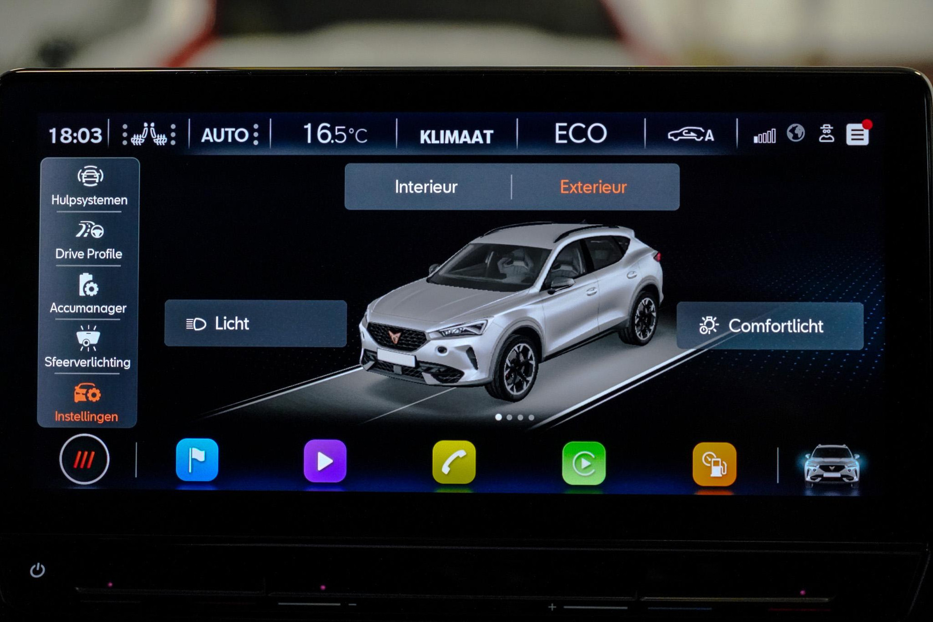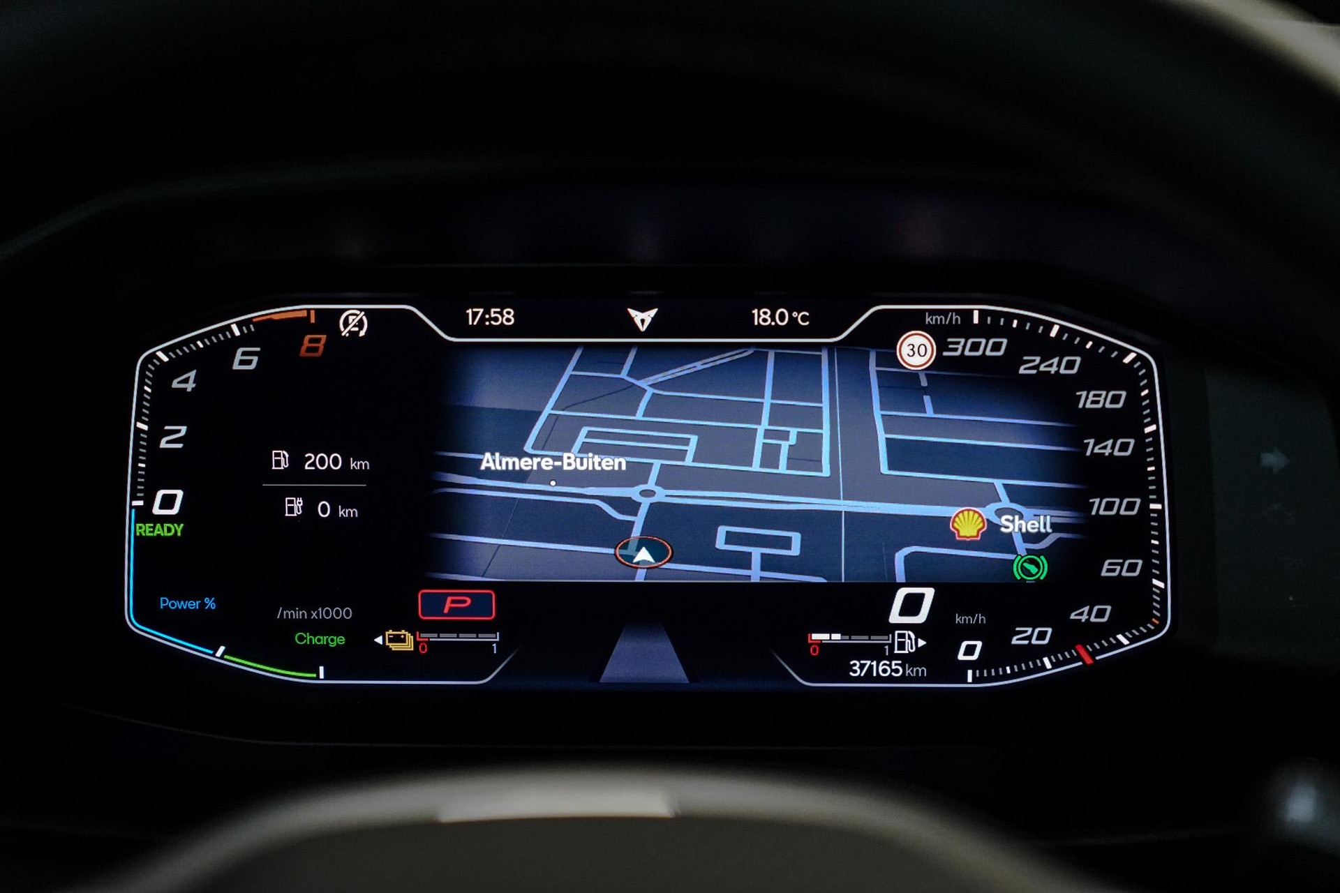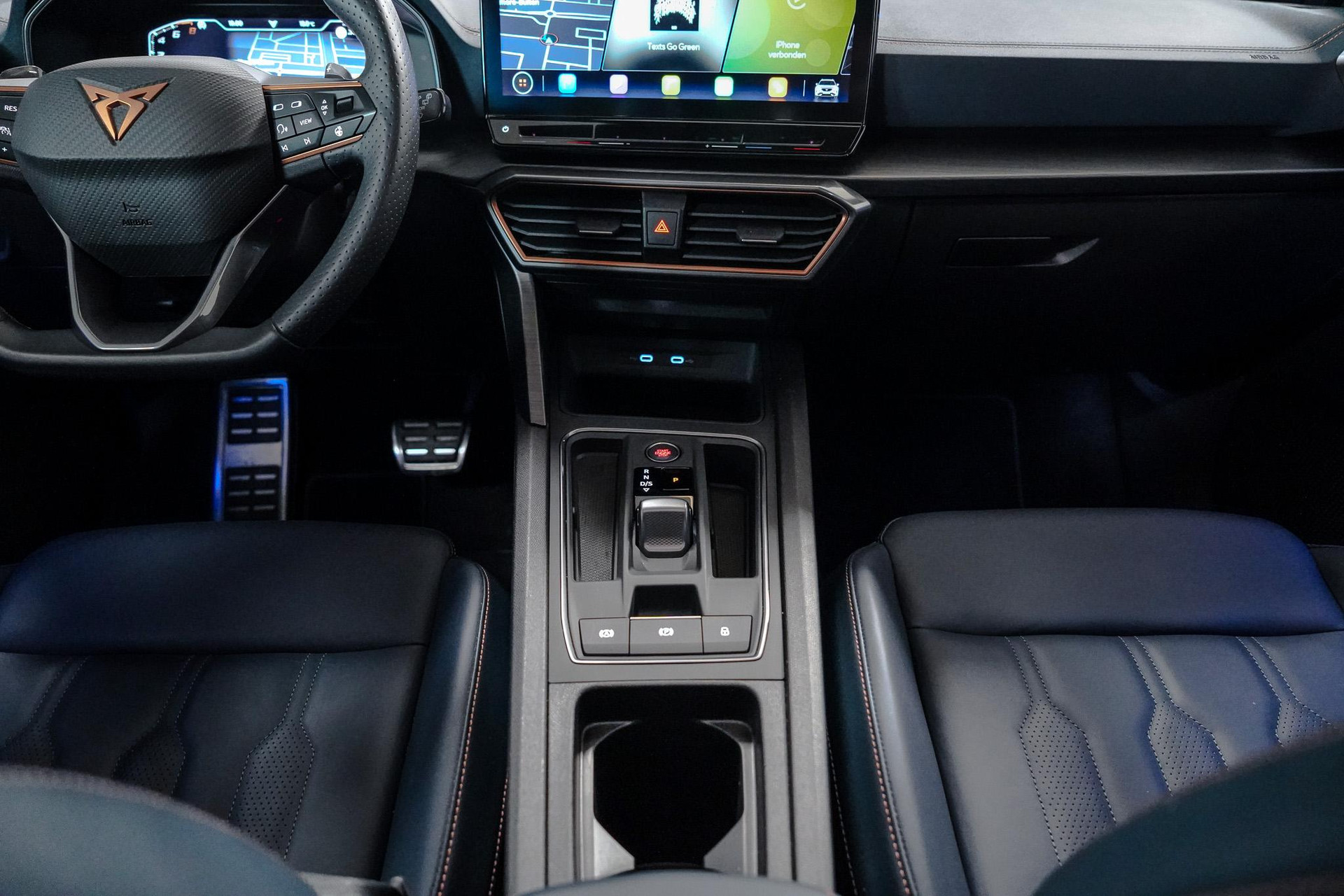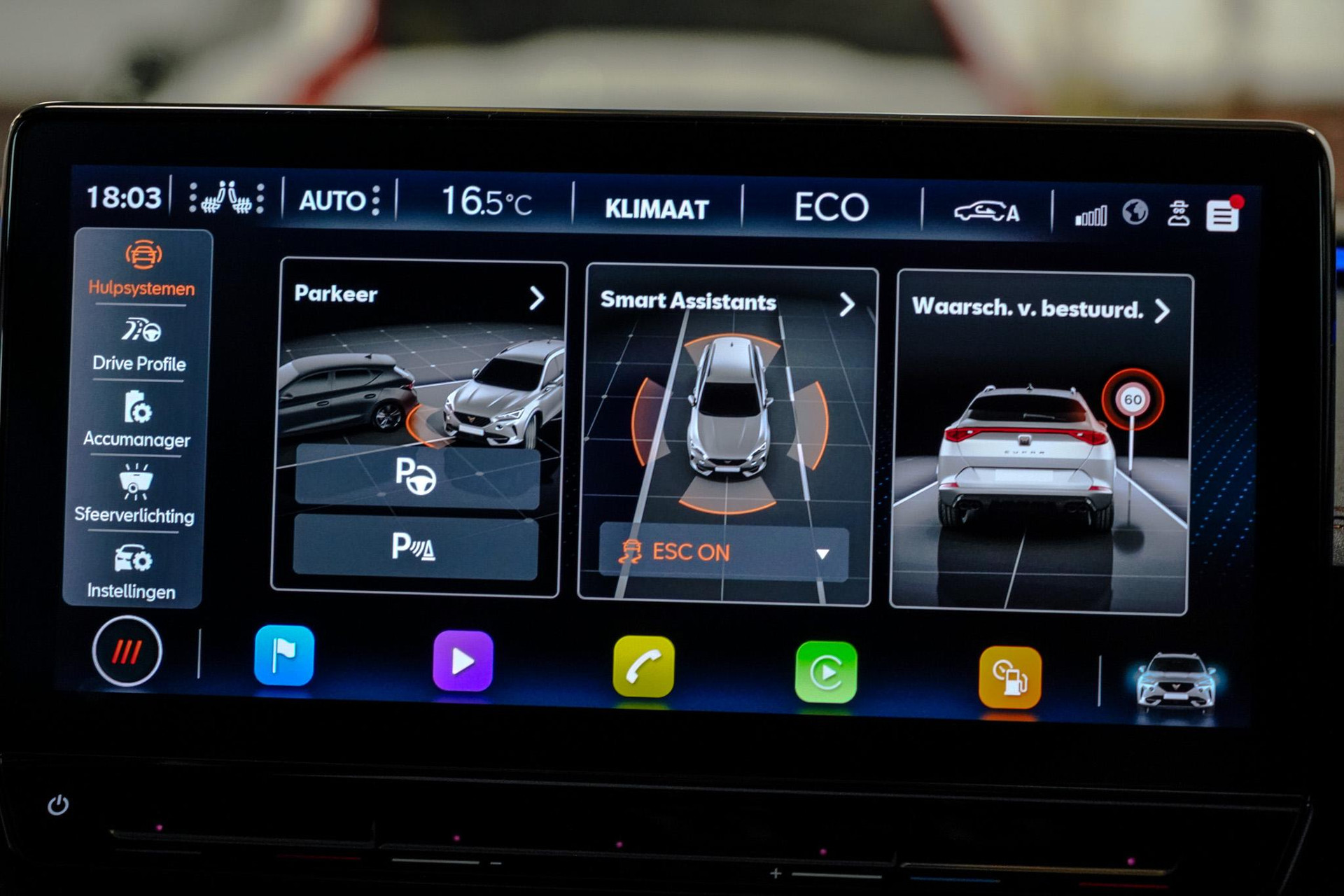 Tijdens de rit wordt u als bestuurder ondersteund door verschillende systemen die de weg en uw omgeving in de gaten houden. Onderweg fungeert de verkeersbord-detectie als het ware als uw bijrijder en attendeert u op de verkeersborden langs de weg. Indien u onbedoeld de rijstrook lijkt te verlaten, reageert het Lane-keeping systeem meteen en corrigeert. Het risico van een kop-staartbotsing wordt aanzienlijk verminderd door de forward collision warning. In deze CUPRA vinden we verder een dodehoekdetectie, hill hold functie, vermoeidheidsherkenning, autonoom remsysteem en bandenspanningcontrolesysteem.