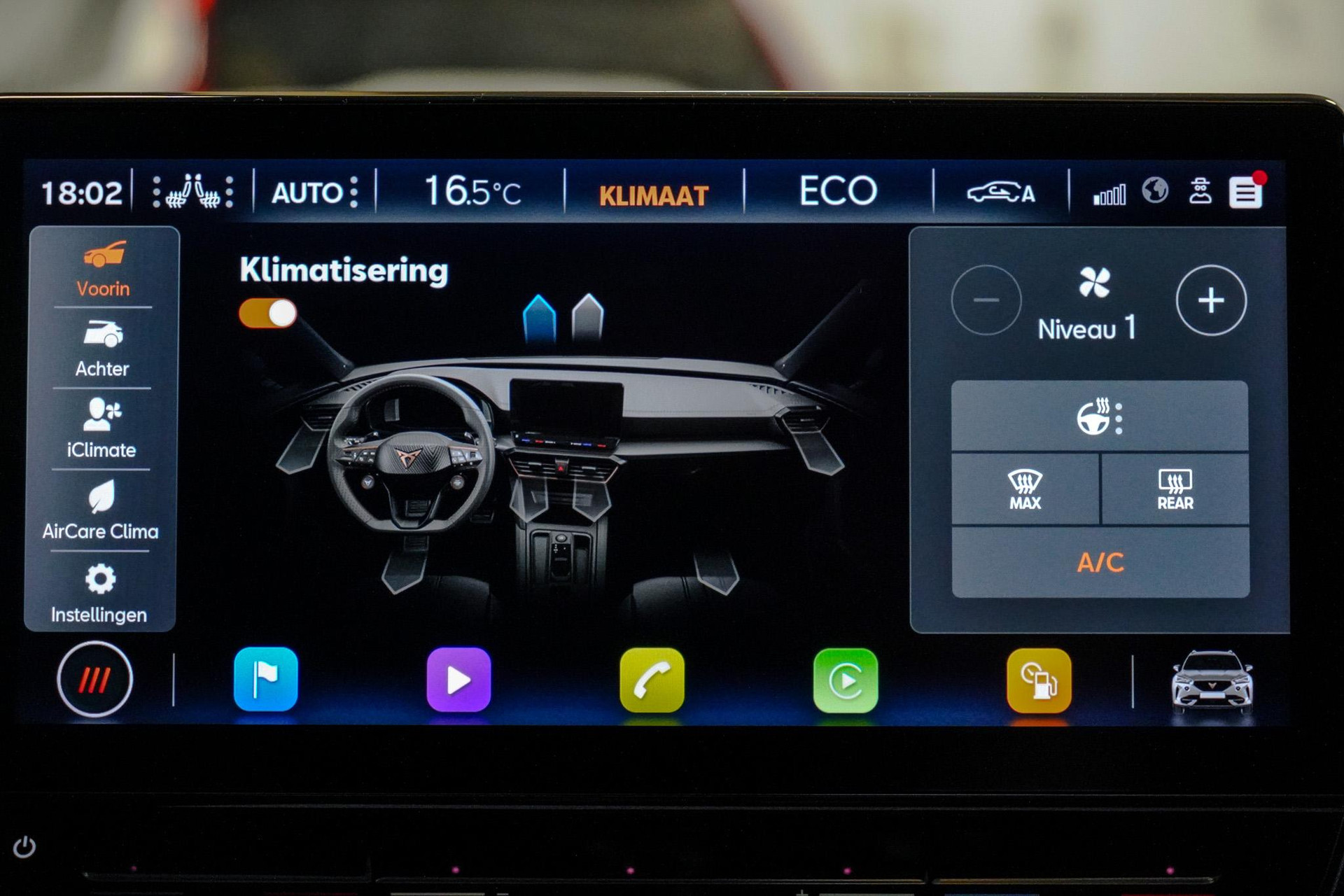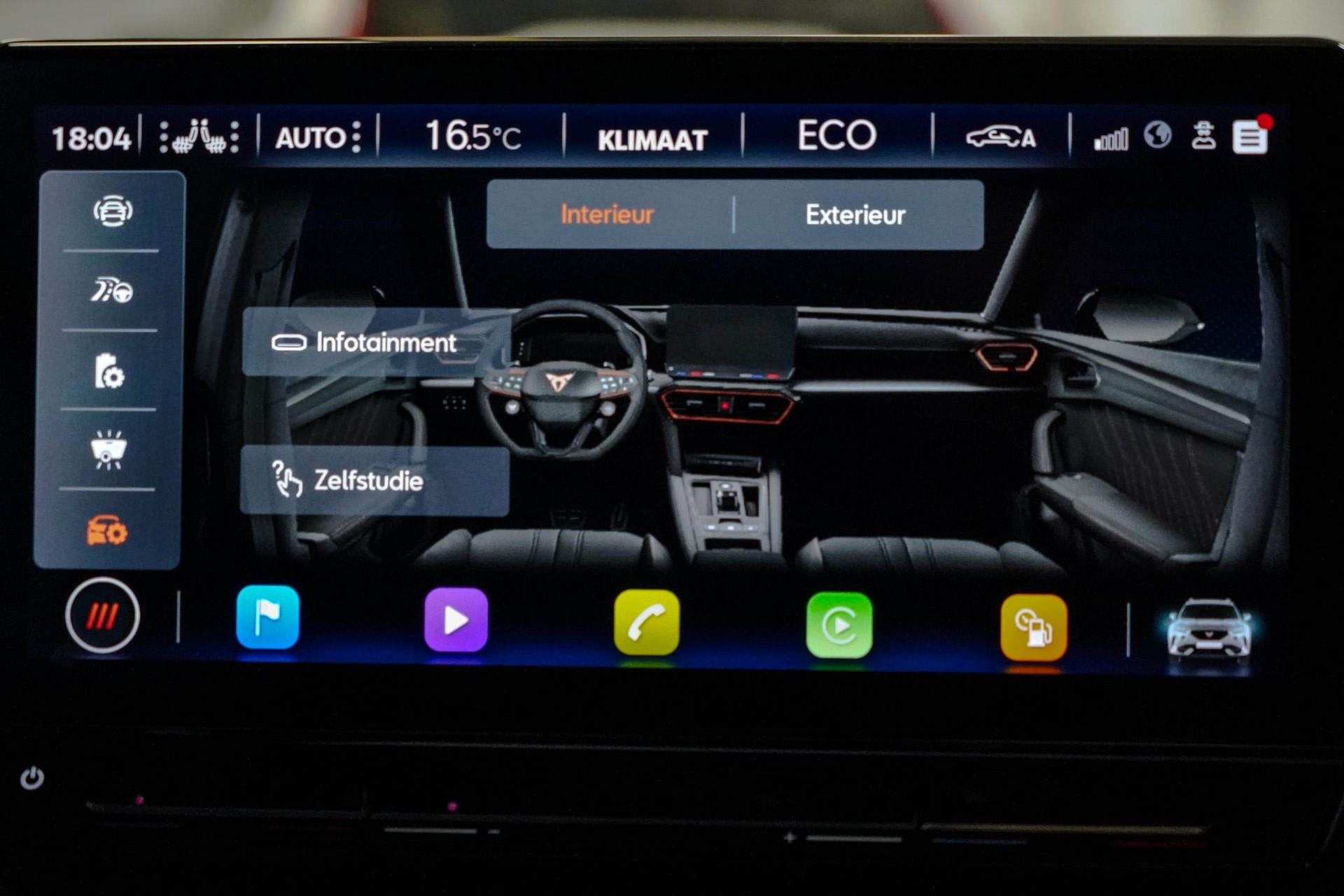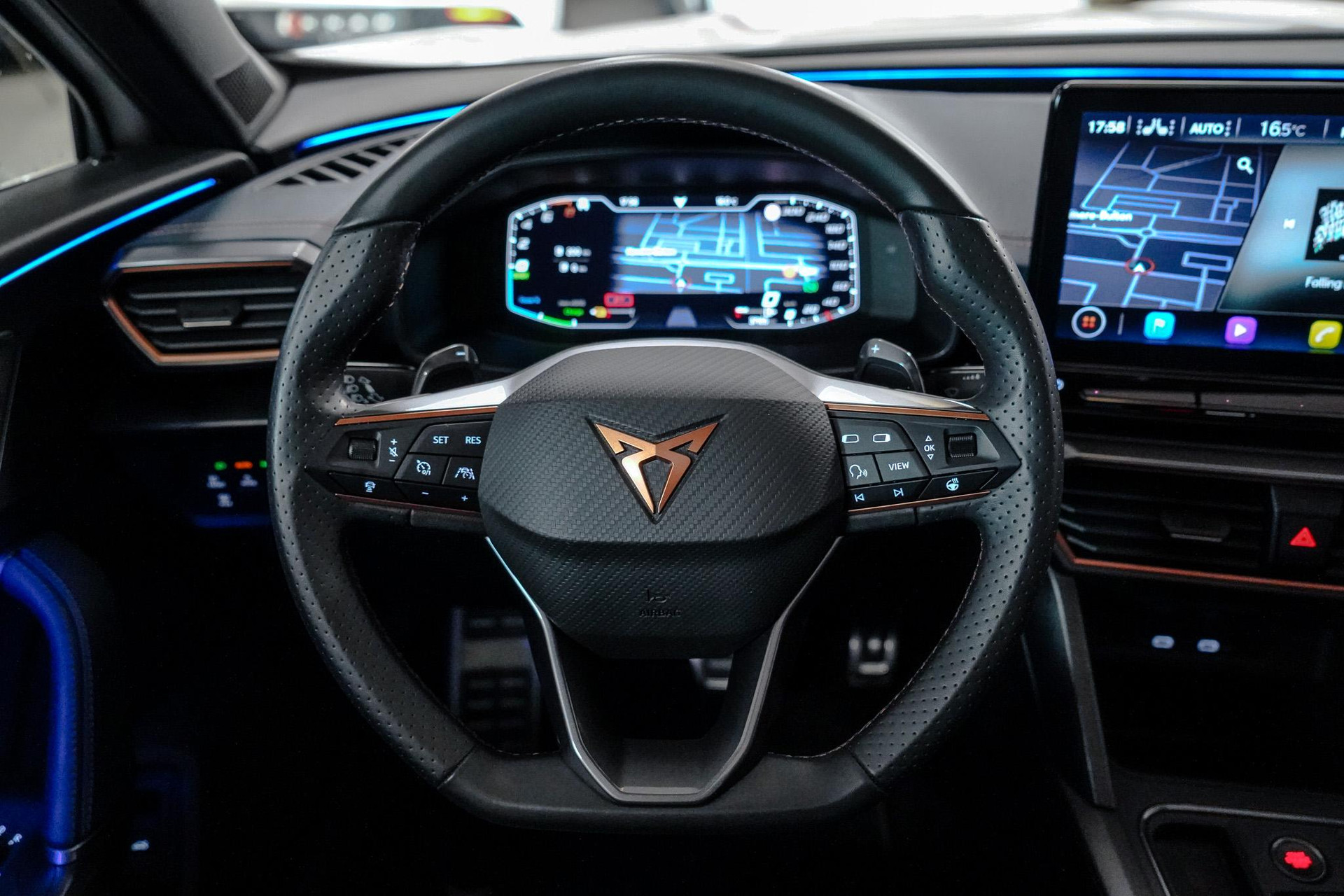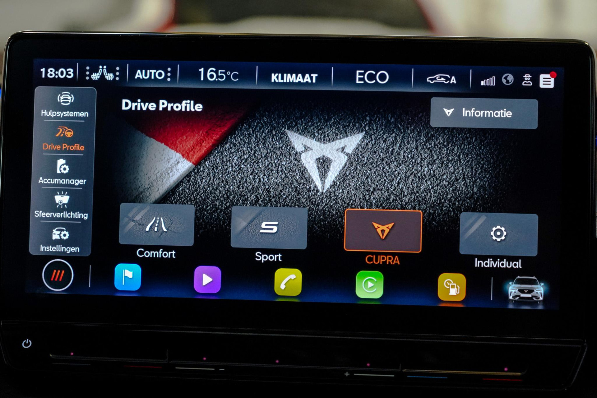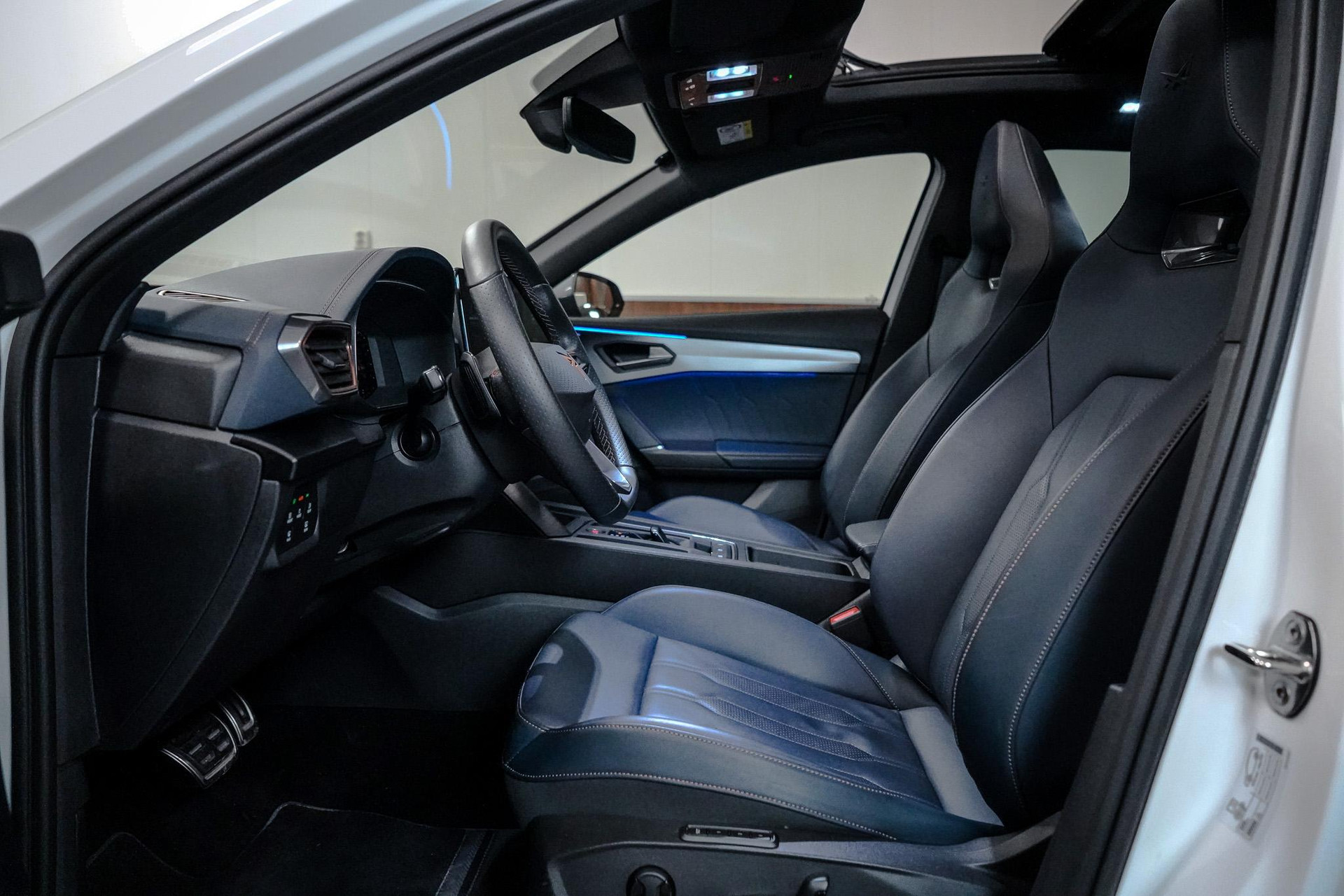 Tijdens de rit wordt u als bestuurder ondersteund door verschillende systemen die de weg en uw omgeving in de gaten houden. Onderweg fungeert de verkeersbord-detectie als het ware als uw bijrijder en attendeert u op de verkeersborden langs de weg. Indien u onbedoeld de rijstrook lijkt te verlaten, reageert het Lane-keeping systeem meteen en corrigeert. Het risico van een kop-staartbotsing wordt aanzienlijk verminderd door de forward collision warning. In deze CUPRA vinden we verder een dodehoekdetectie, hill hold functie, vermoeidheidsherkenning, autonoom remsysteem en bandenspanningcontrolesysteem.